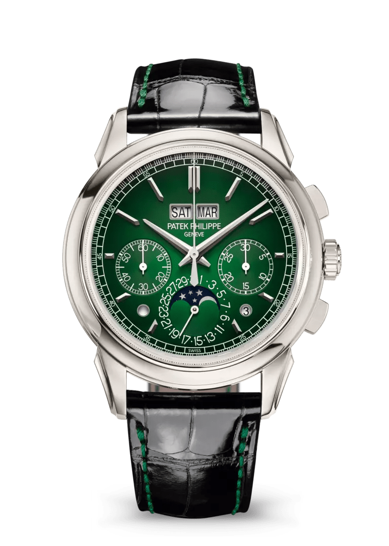 Siyah degradeli çerçeveli lake mavi, beyaz altın uygulanmış fasetli "obus" tarzı saat işaretleri. Beyaz altın fasetli dauphine tarzı kollar.