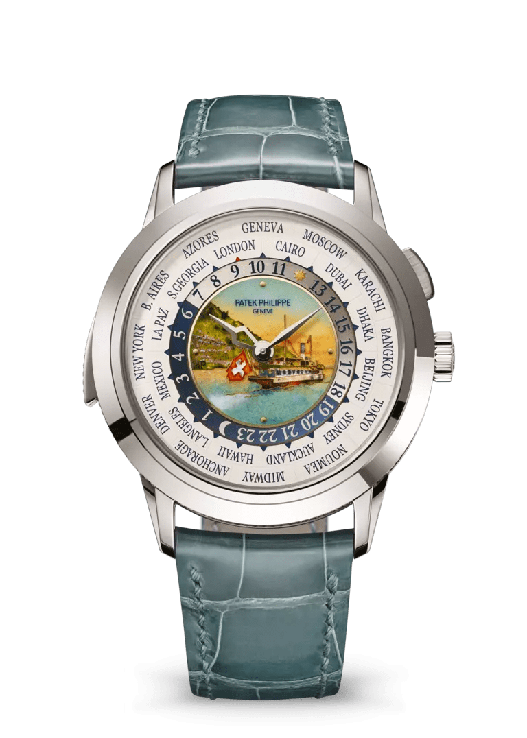 Cenevre Gölü'nde vapur yolculuğunu gösteren Grand Feu cloisonné emaye merkez. 18K altın kadran plakası ve 24 saat halkası. Beyaz altın kollar, saatler için iskeletleştirilmiş "Güney Haçı" takımyıldızı motifi ve dakikalar için eşkenar dörtgen şeklinde.