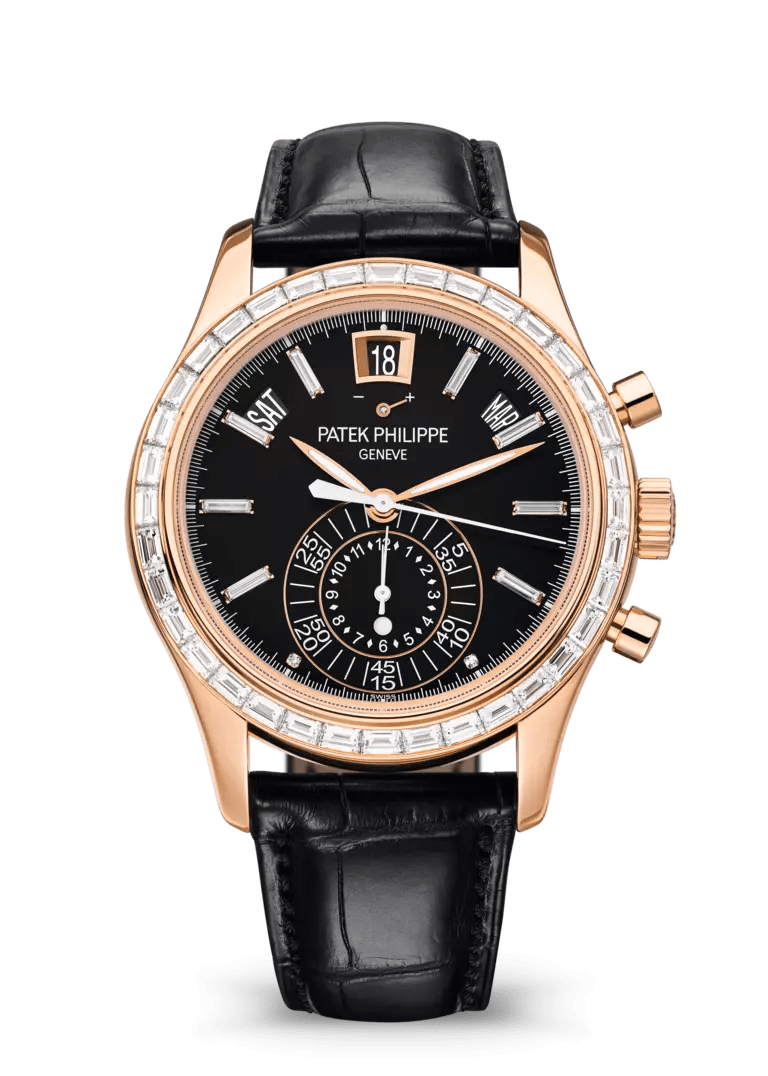 Kraliyet mavisi opalin, baget pırlantalarla süslenmiş beyaz altın uygulanmış saat işaretleri. Beyaz ışıklı kaplamaya sahip beyaz altın yaprak şeklindeki kollar.