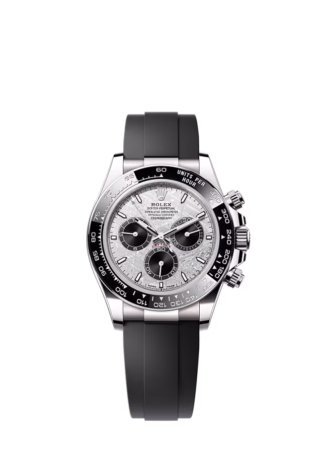 Dayanıklılığın zaferi Karşınızda takimetrik ölçekli siyah Cerachrom çerçeveye sahip, çelik ve parlak siyah kadranı ve Oysterflex bileziğiyle 18 kt beyaz altın Oyster Perpetual Cosmograph Daytona.
