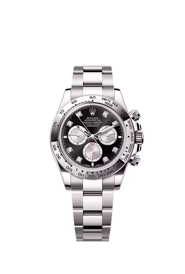 Dayanıklılığın zaferi Bu 18 kt beyaz altın Oyster Perpetual Cosmograph Daytona, çelik ve parlak siyah kadranı ve Oyster bileziğiyle birlikte, işlenmiş takimetrik ölçekli 18 kt beyaz altın çerçeveye sahiptir.