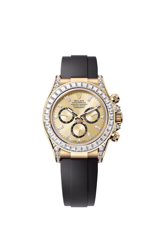 Dayanıklılığın zaferi Bu 18 kt Everose altın Oyster Perpetual Cosmograph Daytona, pırlantalı parlak siyah ve Sundust kadranı ve Oyster bileziğiyle birlikte, işlenmiş takimetrik ölçekli 18 kt Everose altın çerçeveye sahiptir.