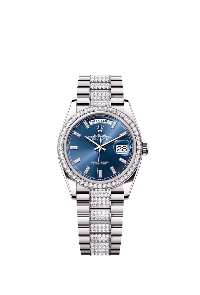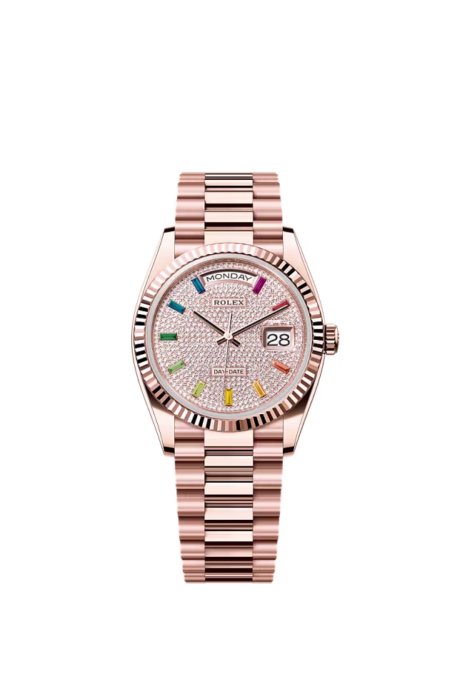 Bir idealin gerçek oluşu Karşınızda 18 kt Everose altın Oyster Perpetual Day-Date 36: pırlanta döşeli kadran, yivli çerçeve ve President bilezik.