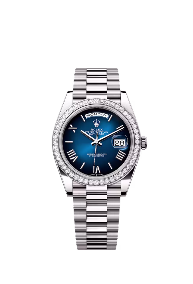 Bir idealin gerçek oluşu Karşınızda 18 kt beyaz altın Oyster Perpetual Day-Date 40: parlak mavi kadran, pırlantalı çerçeve ve President bilezik.