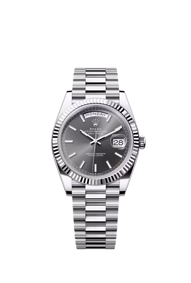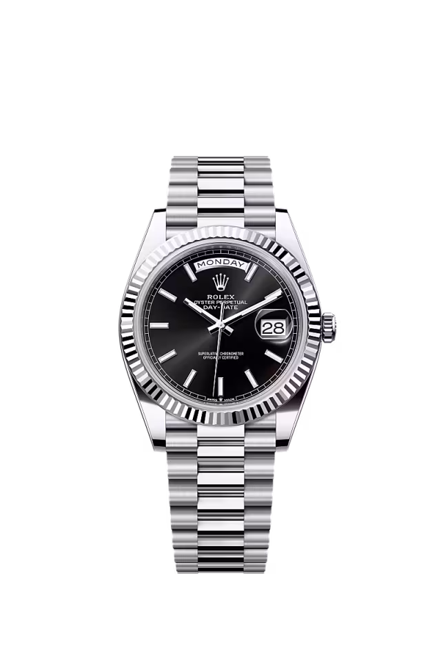 Bir idealin gerçek oluşu Karşınızda platin Oyster Perpetual Day-Date 40: pırlantalı buz mavisi kadran, yivli çerçeve ve President bilezik.