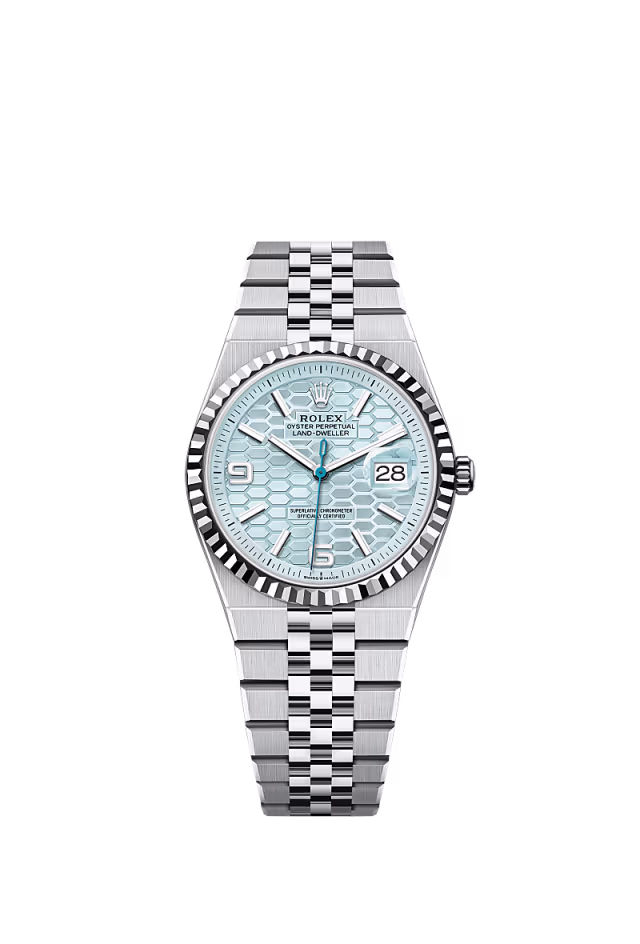 Cüretkâr estetik ve ileri teknoloji Karşınızda yoğun beyaz, bal peteği motifi, pırlantalı kadranlı ve Flat Jubilee bilezikli 18 kt Everose altın Land-Dweller 40.