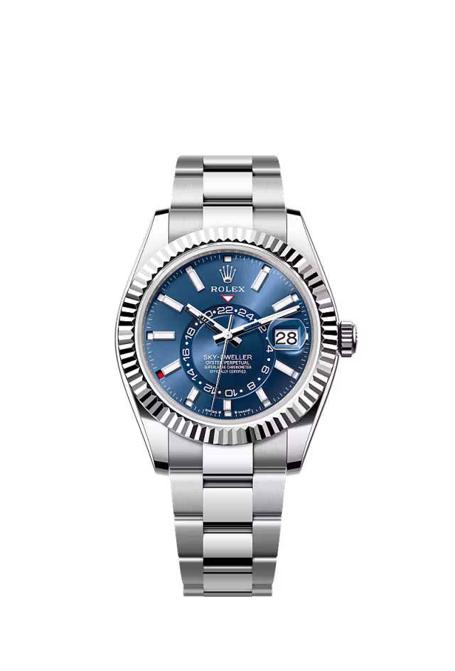 Yüksekten uçmak 18 karat sarı altın Oyster Perpetual Sky-Dweller: parlak siyah kadran ve Oyster bilezik.