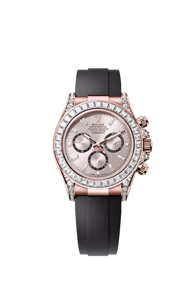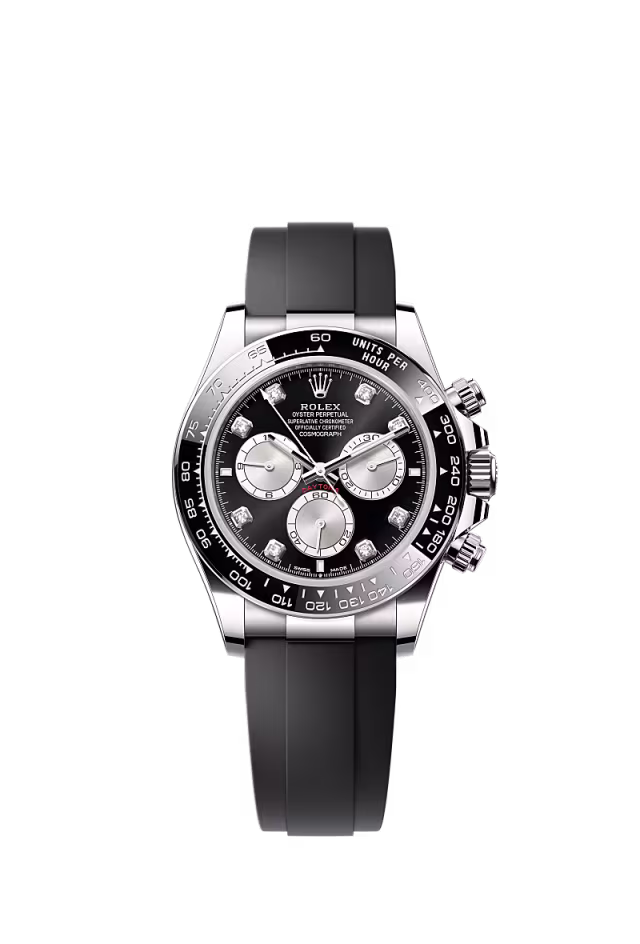 Dayanıklılığın zaferi Karşınızda takimetrik ölçekli siyah Cerachrom çerçeveye sahip, çelik ve parlak siyah kadranı ve Oysterflex bileziğiyle 18 kt beyaz altın Oyster Perpetual Cosmograph Daytona.