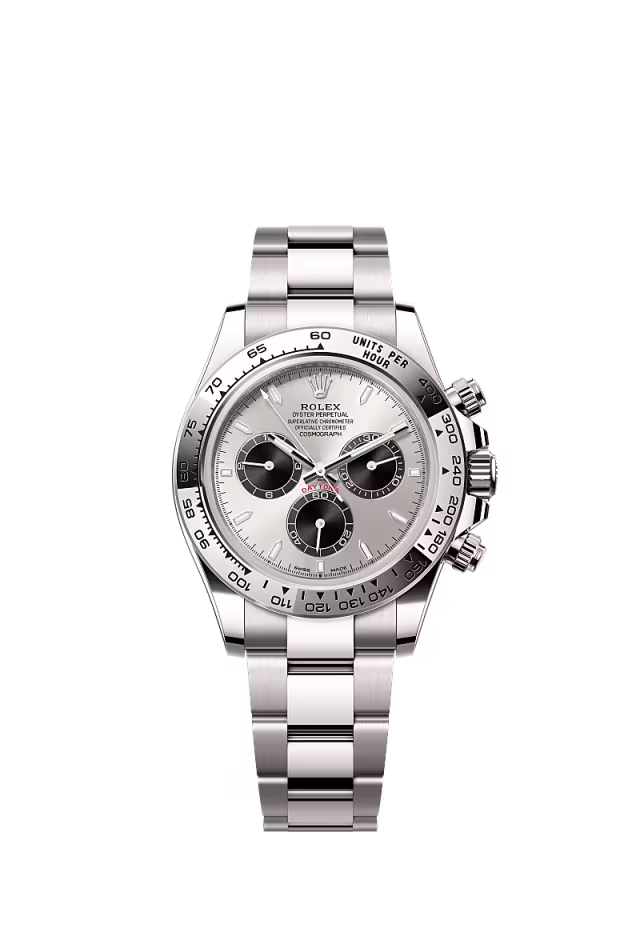 Dayanıklılığın zaferi Karşınızda Oystersteel çelik ve sarı altın Oyster Perpetual Cosmograph Daytona: beyaz kadran ve kontrast yaratan sayaç halkaları. Oyster bileziğe ve işlenmiş takimetrik ölçekli sarı altın çerçeveye sahiptir.
