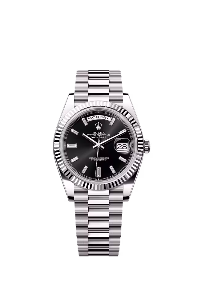 Bir idealin gerçek oluşu Karşınızda 18 kt beyaz altın Oyster Perpetual Day-Date 40: parlak siyah kadran, yivli çerçeve ve President bilezik.