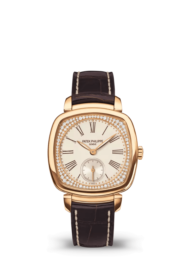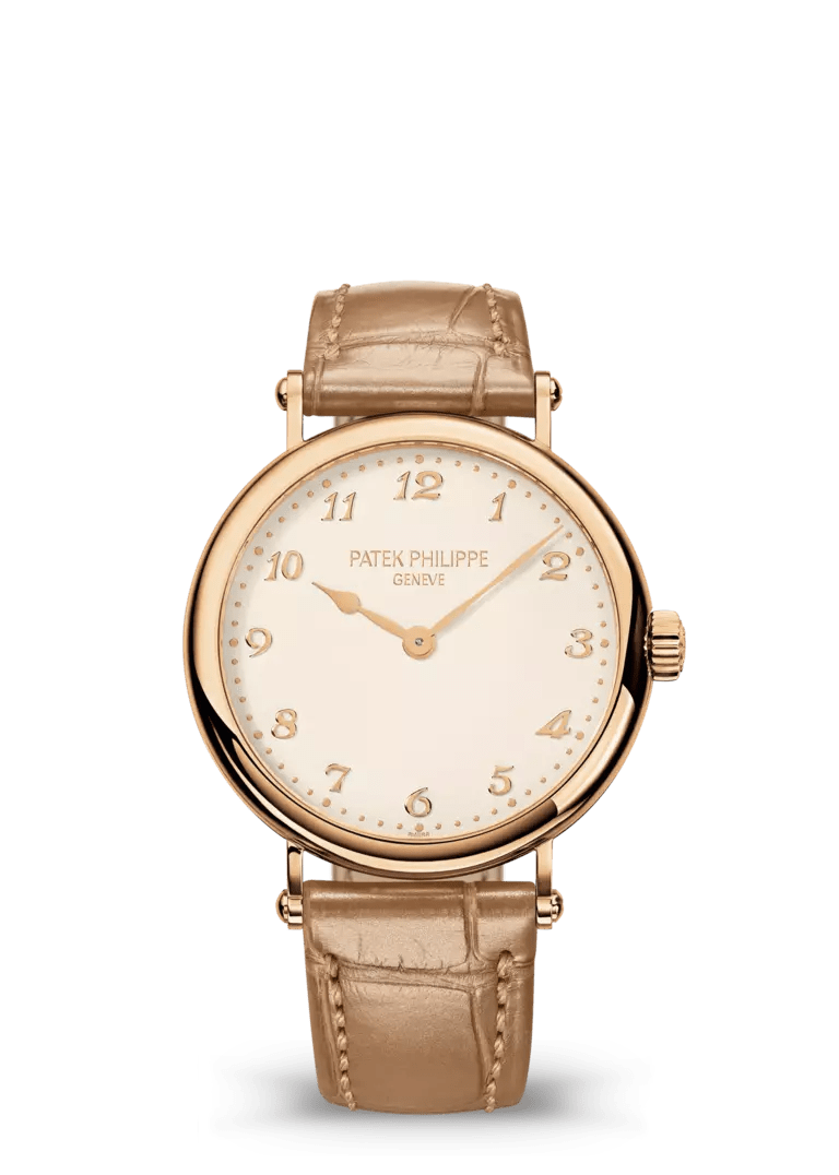 Gümüş damarlı, kahverengi transfer baskılı roma rakamları. Beyaz lüminesan kaplamalı gül altın yaprak şeklindeki kollar.