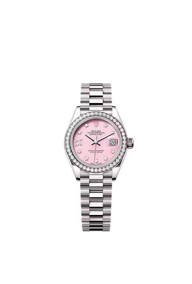 Zarif güzellik Bu 18 kt beyaz altın Oyster Perpetual Lady-Datejust, gümüş kadrana ve President bileziğe sahiptir.